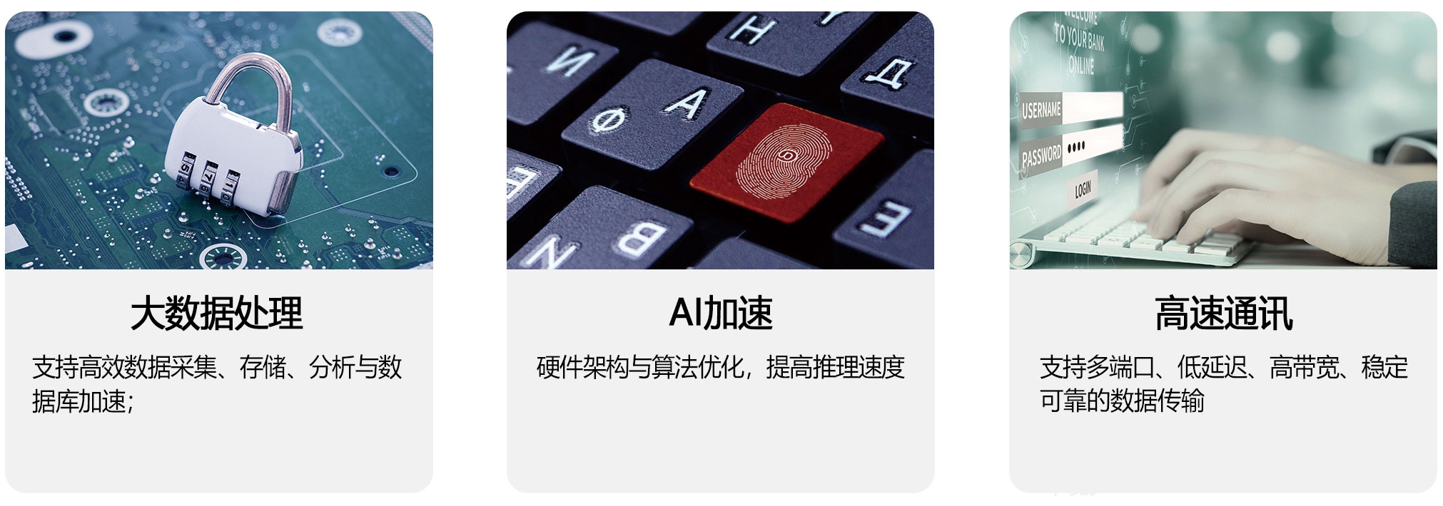 公司生产的拟态计算板卡是一款基于网络接口的高性能加速卡。该卡基于XILINX的高性能Ultrascale+系列FPGA设计,包含1片Zyng Ultrascale+XCZU7EV(主要调度和计算)和1片Ultrascale+ XCVU9P(主要计算)。挂载DDR4 SDRAM缓存单元,最大支持8GB容量,可实现进行复杂逻辑与算法时的数据缓存。网络接口具备超强的数据吞吐能力,合计可边 100Gbps.